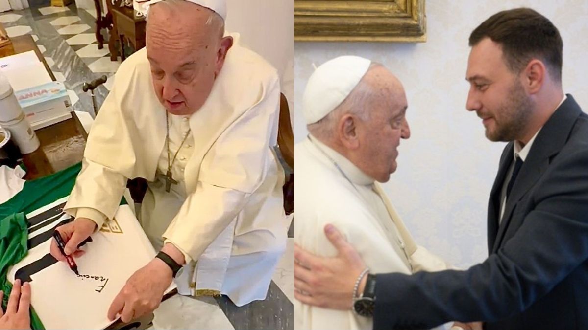 Francisco posó con la camiseta recibida, bendijo otra junto con un rosario y además firmó un diploma que serán exhibidos en el estadio Florencio Sola para todos los aficionados que asistirán al mismo.